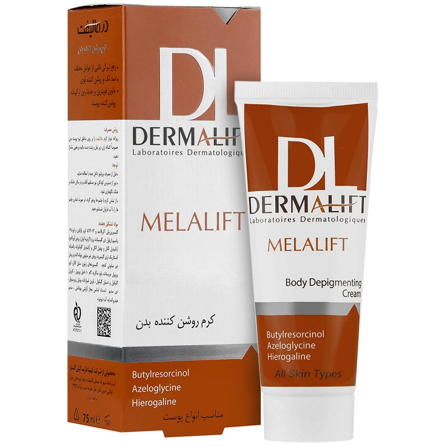 سلول های پوست ماده ای به نام ملانین تولید کرده و توسط این ترکیب است که پوست رنگ می گیرد. هنگامی که سلول های پوست آسیب دیده یا ناسالم هستند، می توانند باعث تولید بیش از حد ملانین شوند. تجمع ملانین هم موجب تیره شدن رنگ برخی نواحی پوست و یا ایجاد لک می گردد. تغییرات هورمونی، عدم محافظت از پوست در برابر نور خورشید، افزایش سن، آسیب های پوستی و التهاب از عواملی هستند که می توانند روی ترشح ملانین اثر بگذارند. کرم روشن کننده نواحی تیره بدن درمالیفت یکی از محصولاتی است که برای کاهش تیرگی و لک های پوست بدن تولید شده و در حجم 75 میلی لیتر تولید و عرضه می گردد. استفاده منظم و روزانه از درمالیفت کرم روشن کننده بدن، به شفافیت و روشن شدن مناطق تیره پوست مثل زیر بغل، کشاله ران، سر زانوها و آرنجها کمک می کند. روشن کننده بدن درمالیفت فرمولاسیونی جدید و قوی دارد که به نحوی موثر لک های مقاوم را از بین می برد. این کرم روشن کننده حاوی ترکیباتی است که در ترمیم آسیب های پوستی ناشی از نور خورشید نقش داشته و به شادابی و شفافیت پوست کمک می کنند.