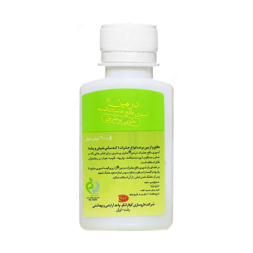 اثر اسپری دافع حشرات درمین به مدت 6 هفته و حتی پس از 6 بار شستشو از بین نخواهد رفت. اثر پرمترین وقتی در معرض نور مستقیم خورشید (اشعه ماورا بنفش) یا هوا (اکسیژن) قرار بگیرد کاهش می یابد با نگهداری لباس های آغشته به درمین در کیسه های پلاستیکی سیاه زمان نگهداری را افزایش دهید. این محصول به لباس آسیبی نمی زند و شما می توانید در مورد پارچه های حساس مانند ابریشم نیز از آن استفاده نمایید. درمین با پارچه های مصنوعی و ضد آب نیز سازگار است و بر روی پلاستیک نیز موثر می باشد. اسپری درمین حاوی پرمترین است که دافع حشره بی بو و بدون رنگ و فاقد چربی است. البته جهت رضایت مشتریان به فراورده اسانس اضافه گردیده است تا رایحه آن باعث احساس خوشایندی در مصرف کننده شود. هر چند که پرمترین از راه پوست جذب نمی شود اما توصیه ما این است که از استعمال این محصول بر روی پوست خودداری نمایید. زیرا این محصول برای لباس و منسوجات تهیه شده است.